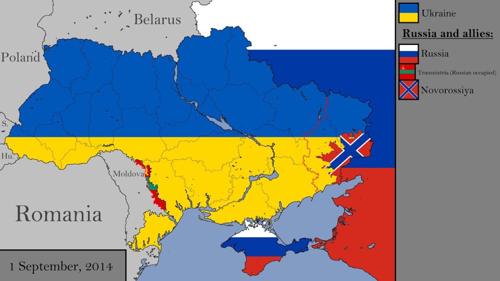 Territorio en 2014 post "Euromaidán", con Crimea como territorio ruso y Donetsk y Lugansk buscando ser una nueva nación.