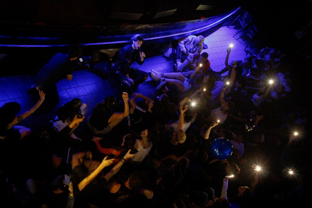 Calibran desde el segundo piso las luces y se escucha un grito proveniente del público. Poco a poco, las mesas comienzan a quedar vacías, mientras la gente empieza a bailar frente al escenario.