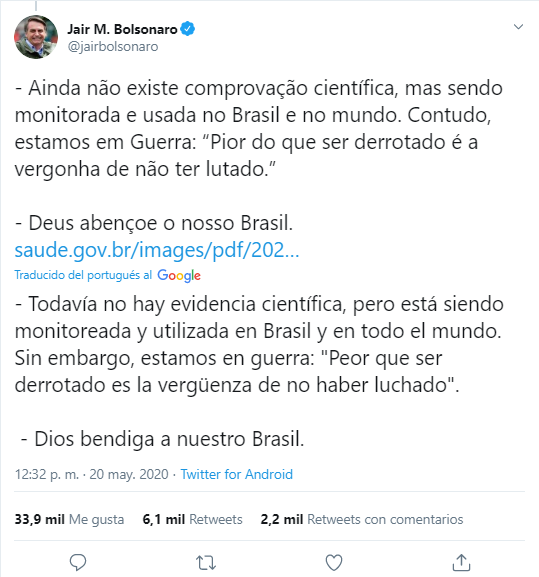 Además de continuar con la subestimación de los efectos del virus, la agitación a no cumplir con las medidas de aislamiento impuestas por los gobernadores, que a su vez son acusados de adoptar "medidas coercitivas extremas", y la promoción del uso de cloroquina, droga que no está recomendada para tratar al COVID-19 y que, a partir de la campaña oficial, empezó a faltar en las farmacias y las personas que deben usarla para el tratamiento de otras enfermedades no las consiguen.