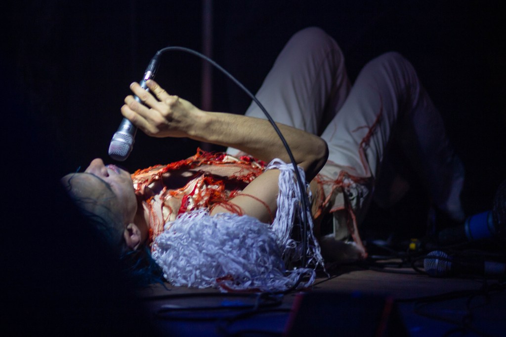 Las presentaciones del proyecto siempre se destacaron por brindar más que músicos tocando en vivo, aunque así fuera suficiente. En su escenario suceden otras cosas, habitan personajes, hay coreografía, interacción, teatralidad. Un universo que interpela al público. Sin embargo, la puesta de La comedia del horror latino fue diferente: escaló a otro nivel.