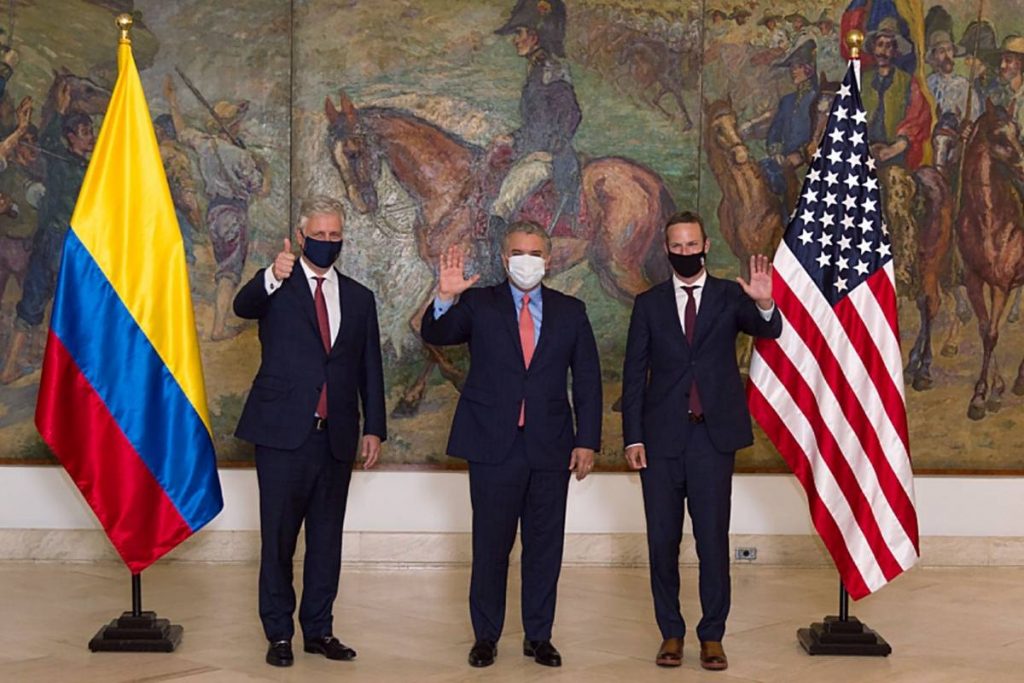 Iván Duque junto a Robert O’Brien, consejero de Seguridad Nacional de Estados Unidos (Izq.) y Adam Boehler, director general de la Corporación Financiera de Desarrollo Internacional de Estados Unidos (Der.) tras la firma del Plan Colombia Crece (EFE).