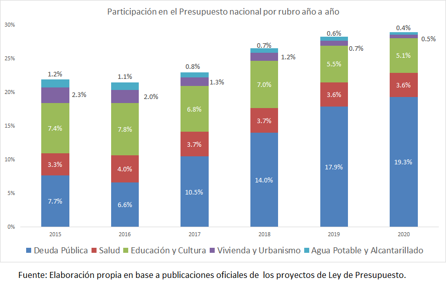 El Estado recortó en áreas sociales sensibles, como son educación, trabajo, vivienda y agua potable y alcantarillado, justificando el ajuste fiscal por la falta de ingresos u exceso de gasto, cuando en realidad la política económica desplegada desde el 11 de diciembre del 2015 es la que generó la crisis actual. Aumentando el peso de la deuda en el presupuesto nacional, sin un correlato en mejoras concretas para la sociedad.