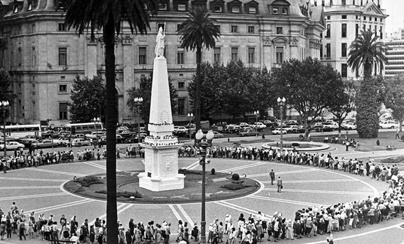 Ninguna de las catorce se fue, y despacito, agarradas de la mano, empezaron a caminar alrededor de la pirámide de Mayo, gritando que sus hijxs faltaban, y pidiendo que alguien les dé una respuesta. Dicen que un jueves fue la primera, y un jueves, también, fue la segunda. Todos los jueves, desde aquel 30 de abril, las mujeres con sus pañuelos fueron a la plaza, y marcharon alrededor de la pirámide, y gritaron que sus hijxs faltaban, y que lxs responsables se tenían que hacer cargo.