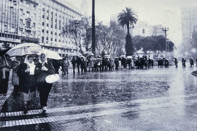 Así que fueron catorce la primera vez. Era un jueves y hacía calor, y catorce mujeres interrumpieron con sus pañuelos en el medio de la plaza gritando que sus hijxs no estaban en sus casas. La policía las escuchó, y acudió a sus gritos: “Tienen que circular, señoras. No se pueden quedar acá reunidas. Si hacen eso, se van a tener que retirar”. Otra vez, no eran momentos para mucho grito.
