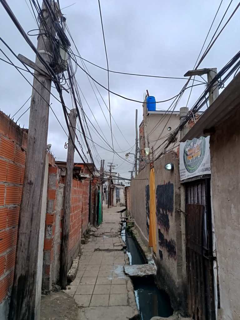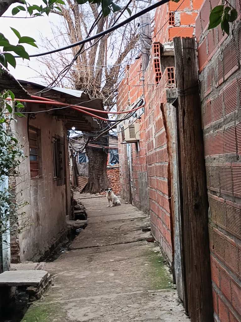 El pasillo zigzaguea y cambia su geografía en cada curva, de repente puede aparecer una pintada en aerosol reclamando el mando de ese tramo y algunos nombres dando a entender la conformación de una banda, también se cruza algún Perón Vuelve, un pequeño santuario del Gauchito Gil o un stencil de la Virgen. Lo que nunca desaparece son los miles de cables que viajan por encima de los techos de chapa y la pequeña zanja que también zigzaguea siguiendo el ritmo interno del barrio, llevando un agua gris brillante que deja ver restos de jabón y grasa.