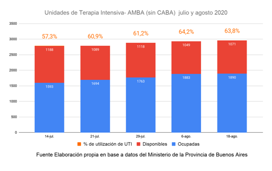 La figura inferior (figura 1) compara el incremento de números de camas de terapia intensiva y de la ocupación de las mismas entre los días 14/07, 21/07, 29/07, 06/08 y 18/08 del año 2020. Cada barra representa el número total de camas de terapia intensiva del sistema sanitario provincial. En rojo se muestran las camas disponibles, en azul las camas ocupadas. En el eje vertical se puede observar el crecimiento en el número de camas totales, y se observa una leve disminución del porcentaje de utilización, debido al aumento de Unidades de Terapia Intensiva entre el 06/08 y el 18/08