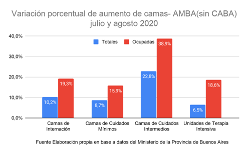 La figura 2a y 2b (inferior) compara la dinámica de aumento de la cantidad de camas de internación con la utilización de las mismas para el AMBA (sin CABA) para cuidados mínimos, intermedios e intensivos, entre los días 14/07 al 18/08 del 2020. En la figura 2a las barras azules muestran el porcentaje de aumento de las camas totales y las rojas muestran el aumento en el porcentaje de las camas ocupadas. La diferencia entre ambas, evidencia que de mantenerse este ritmo el sistema puede saturarse y colapsar.