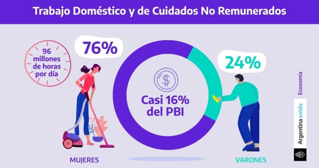 En 2020, la Dirección Nacional de Economía, Igualdad y Género, que conduce Mercedes D’Alessandro, realizó el informe “Los cuidados, un sector económico estratégico. Medición del aporte del Trabajo doméstico y de cuidados no remunerado al Producto Interno Bruto”, y puso en números uno de los principales reclamos del movimiento feminista: el 75,7% de las tareas de cuidado en el país son realizadas por mujeres, más de las tres cuartas partes, y se dedican diariamente 96 millones de horas de trabajo no remuneradas a las tareas del hogar y los cuidados. Y advirtió sobre el peso de este trabajo no remunerado en el sistema productivo nacional: el Trabajo Doméstico y de Cuidados No Remunerado representa el 16% del PBI (Producto Bruto Interno) y es el sector de mayor aporte en toda la economía.