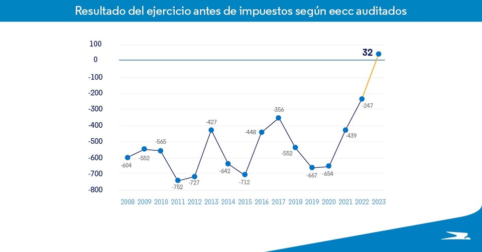 Ese gráfico representa la evolución del balance comercial de Aerolíneas Argentinas, publicado en el año 2023 por el presidente de entonces, Pablo Ceriani. Además de demostrar las ventajas de poseer un brazo de control nacional aéreo y llegar a donde el negocio no llega para traer las vacunas en la pandemia del COVID-19, la empresa demostró que se puede proyectar la sustentabilidad de la misma.